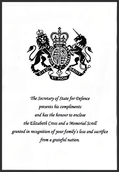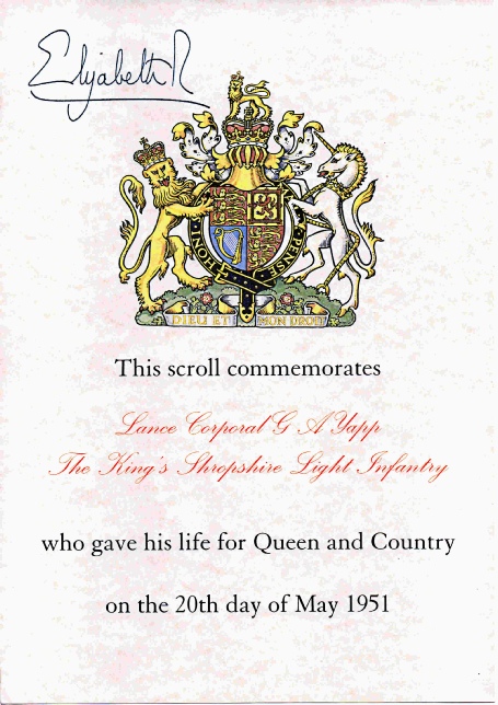 This was received circa 1954-55 I remember well when the post man delivered this scroll in 1954-55 and for a long time it was all that I had of my Dad. My Gran had it framed at the local photographers studio called "Allsops" Mr Allsop missed the slip "by command of the Queen" out of the frame, she took it back and had them re-do it again. I don't think she ate for a week to pay for it. God Bless her!