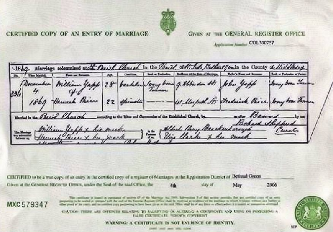 William Yapp married Hannah Maria Price Bethnal Green London in 1869.