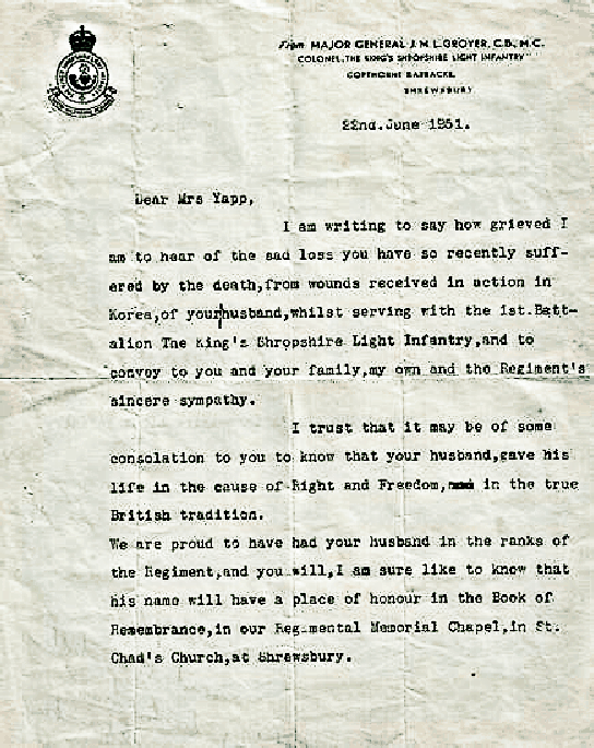 Lt Lanyon J W. K.S.L.I was later killed on the 26th July 1952 in a tragic accident whilst on active service he was only 23 years old.