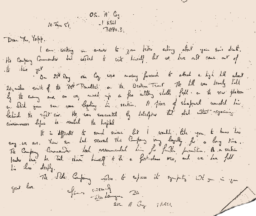 On the 25th May [*incorrect was the 21st May] our coy was moving forward to attack a high hill about 20 miles south of the 38th parallel on the western front. The hill was heavily held by the enemy and as we moved up a few artillery shells fell on the rear platoon in which your son was leading his section. A piece of shrapnel wounded him behind the right ear. He was evacuated by helicopter but did not regain consciousness before he reached hospital.[*]