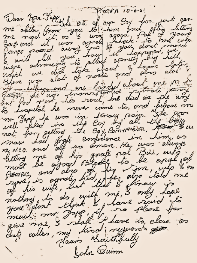 The OC of our Coy has just shown me a letter from you to him and after letting me read it as I was a good pal of your son and it was a great shock to me when George passed away, so if you don't mind I will tell you how it happened, we were advancing to attack a pretty big hill which we did take about 3 hours later. There was a lot of noise and obviously a lot of shelling and one dropped about 1 yard from George, he was transported straight away but God rest his soul he died on the way to hospital he never came to and believe me Mr Yapp he was in no pain. He was well liked in the Coy by all the boys not forgetting the Coy commander we know had great confidence in him as an NCO and also as a man. He was always telling me of his great pal Bill who must be a good bloke to be a pal of George's and also of his son who I am sure is a great kid, he also told me about his wife but that I know has nothing to do with me. I only hope you don't think I have said to much Mr Yapp if so please forgive me I shall have to close now as duty calls, my kind regards